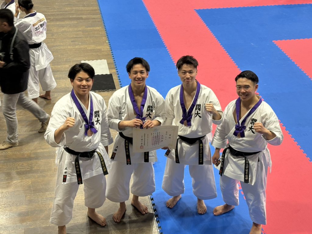 近畿地区1として出場した男子団体形チームは、全国の強豪が集う中、完成度の高い演武を披露し、見事「第3位入賞」を果たしました。一般、学生、高校生全てが集う本大会での表彰台は大変価値ある成果です。